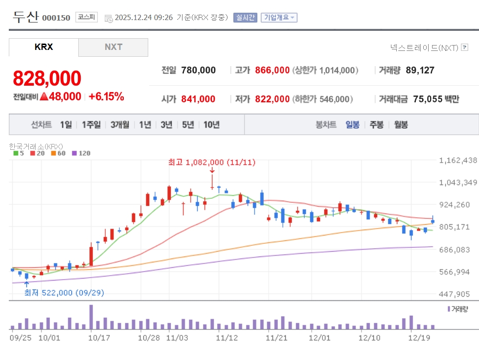 이미지 확대보기24일 한국거래소에 따르면 두산은 이날 오전 9시 26분 현재 전 거래일 대비 6.15% 오른 82만 8000원에 거래되고 있다. 두산우 역시 5.54% 오른 51만 4000원을 가리키고 있다.