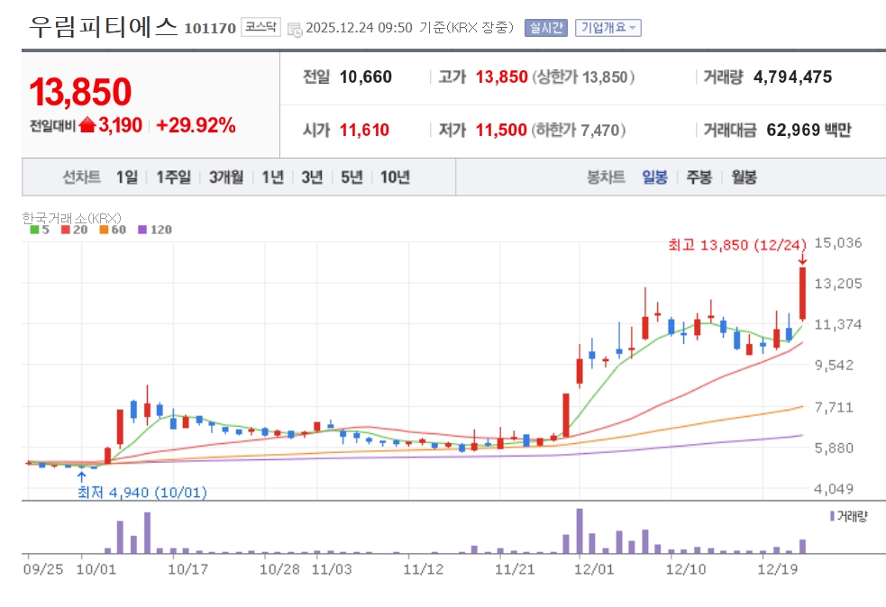 24일 한국거래소에 따르면 우림피티에스는 오전 9시50분 전장대비 29.92% 오른 1만3850원을 기록 중이다.