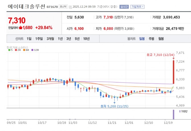 24일 한국거래소에 따르면 에이테크솔루션은 9시 59분 기준 29.84% 오른 7310원을 기록 중이다.