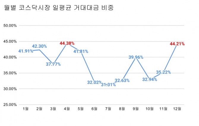 그러나 11월 들어 코스닥 비중은 35.22%로 반등했고, 12월에는 44.21%까지 높아졌다. 연중 저점과 비교하면 12%포인트 이상 회복한 수치다. 이는 단순한 월말 효과나 기술적 반등으로 치부하기에는 변화의 폭이 작지 않다는 평가다.