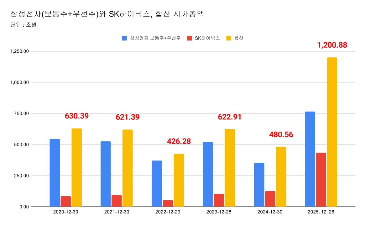 이미지 확대보기국내 반도체 대표주인 삼성전자(보통주·우선주)와 SK하이닉스의 합산 시가총액이 사상 처음으로 1200조원을 넘어섰다. 국내 증시를 이끄는 반도체 양대 축이 동시에 몸집을 키우며 새로운 이정표를 세웠다.