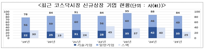올해 코스닥시장에는 스팩을 제외하고 총 84개 기업이 신규 상장했다. 일반기업은 49개로 전년 대비 증가했으나, 기술기업은 35개로 소폭 감소했다. 다만 상장 기업 수 감소에도 불구하고 공모 규모는 약 2조5000억원으로 전년보다 늘었고, 공모가 기준 상장 시가총액은 15조3000억원으로 2021년 이후 최대치를 기록했다.