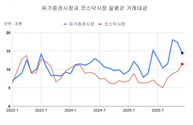 코스피와 코스닥의 온도 차는 10~12월 3개월간 극명하게 갈렸다. 코스피 일평균 거래대금은 10월 18조1000억 원으로 3년 내 최고치를 기록한 뒤 11월 17조4000억 원, 12월 14조5000억 원으로 두 달 연속 하락했다.