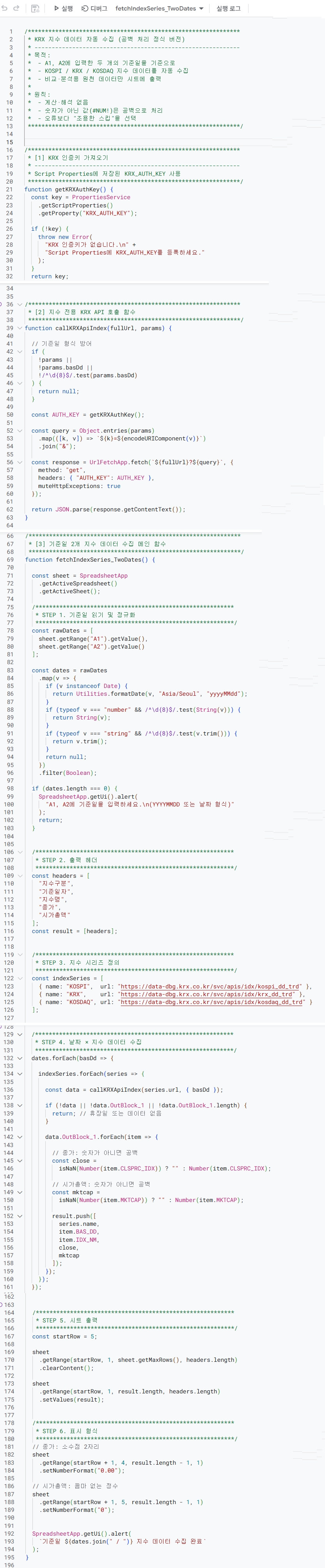 사전에 발급받은 한국거래소 OPEN API 인증키는 코드에 직접 하드코딩하지 않고 속성(Properties)에 저장해 보안과 유지 관리를 분리했다. 지수 데이터를 불러오는 스크립트는 종목 자동화와 완전히 분리된 전용 함수로 구성했다. 그리고 가장 중요한 원칙을 하나 정했다.