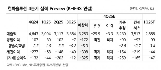 아울러 “2026년에는 모듈 가동 정상화되며 연간 영업이익 개선 흐름을 이어갈 전망”이라며 "다만 지난해 4분기 실적 전망과 관련해선 영업적자 1723억원(영업이익률 -5.3%)으로 컨센서스를 하회할 것"이라고 부연했다.