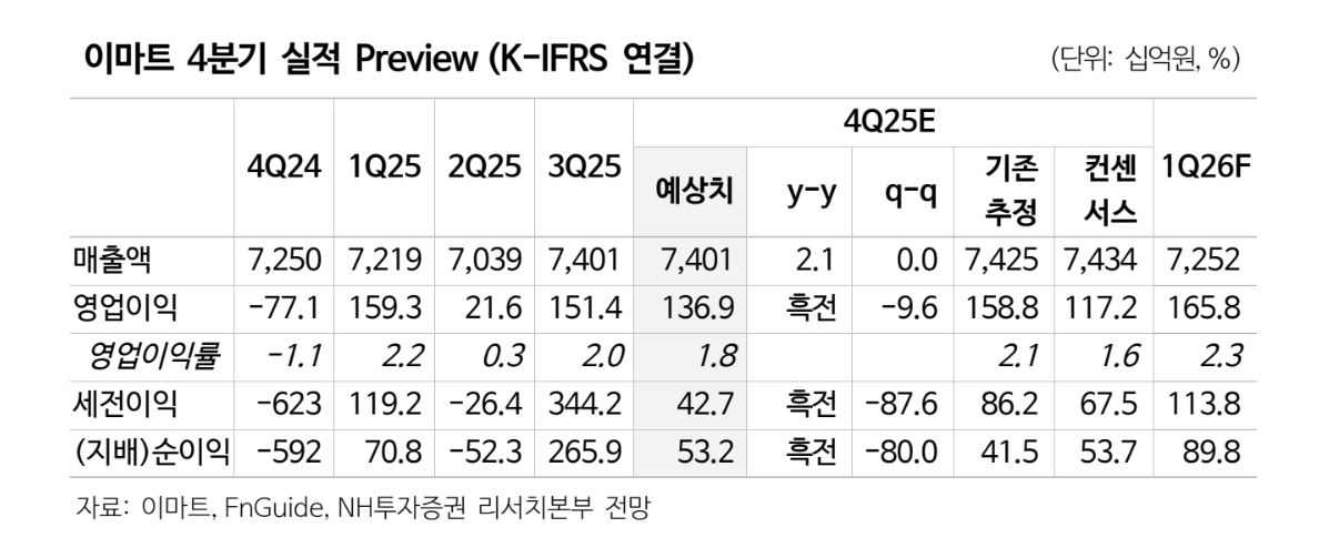이미지 확대보기주영훈 NH투자증권 연구원은 “2025년 이마트의 오프라인 사업은 판관비 절감과 통합 매입 효과로 실적 반등에 성공했다”며 “반면 온라인의 경우 SSG닷컴·G마켓의 영업손실 확대가 기업가치 상승의 부담 요인으로 작용해 왔다”고 평가했다.
