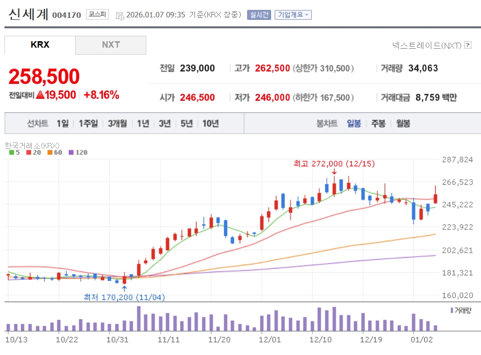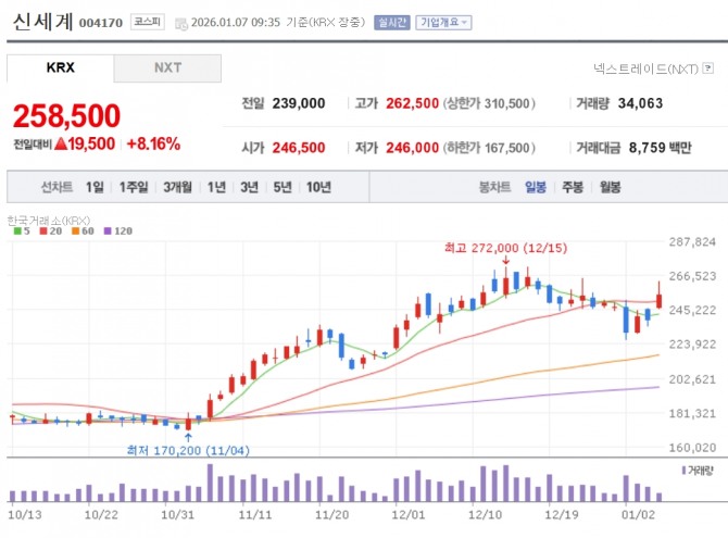 이미지 확대보기7일 한국거래소에 따르면 오전 9시 35분 현재 신세계는 전 거래일보다 8.16% 오른 25만 8500원에 거래되고 있다.