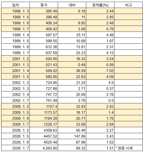 1980년 코스피 출범 이후 신년 초반 최장 랠리는 2001년 1월에 기록됐다. 당시 코스피는 1월 2일부터 1월 9일까지 6거래일 연속 상승하며 520.95에서 589.92까지 약 13.2% 급등했다.