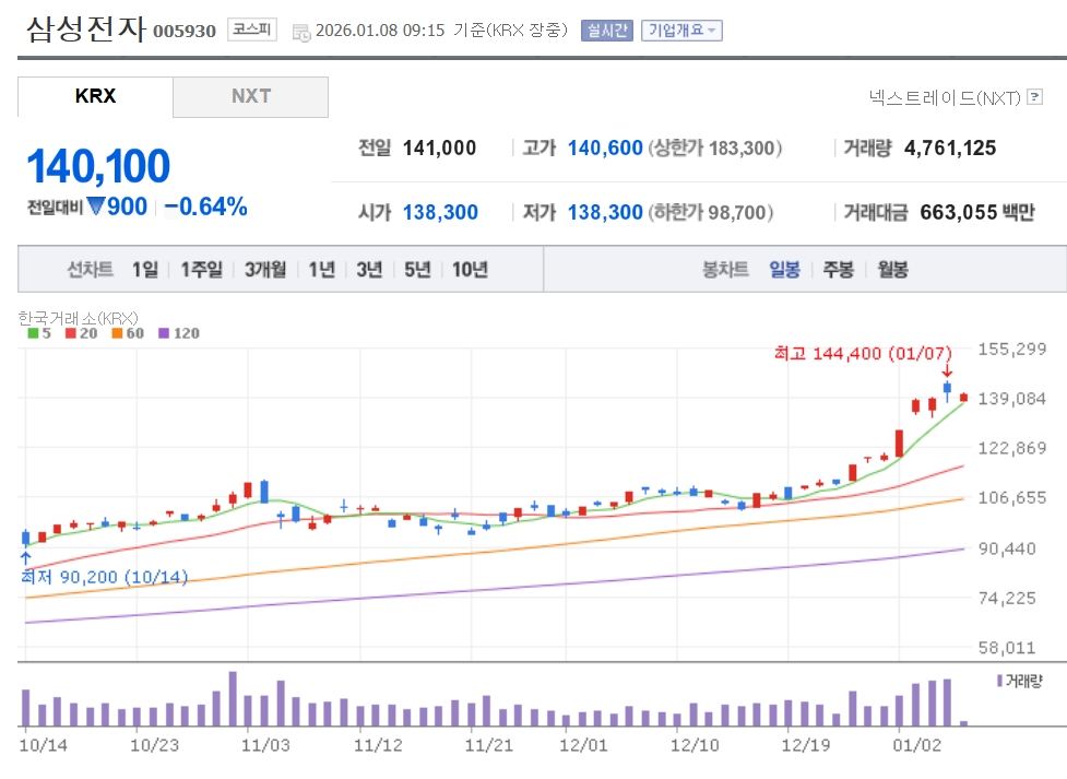 이미지 확대보기8일 한국거래소에 따르면 오전 9시 15분 삼성전자 주가는 전 거래일 대비 0.64% 내린 14만100원에 거래되고 있다.
