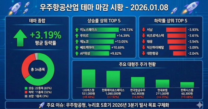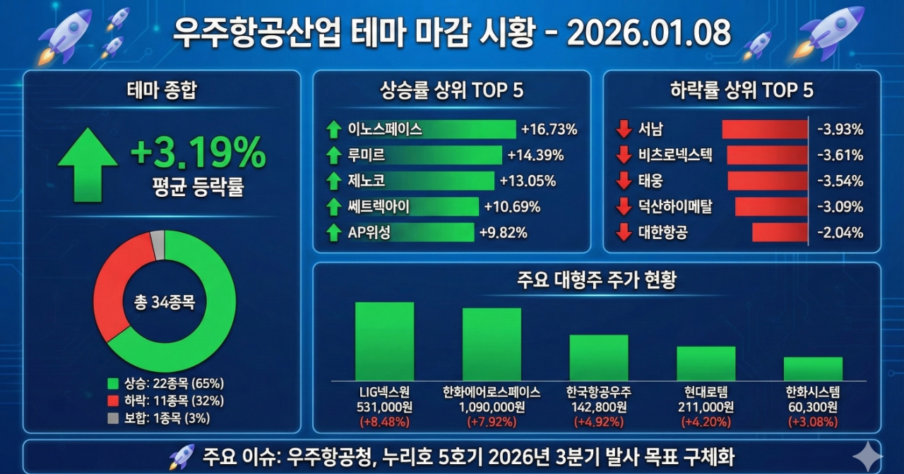 이날 우주항공산업 테마는 누리호 발사 일정 구체화라는 재료 속에 다수 종목이 상승 탄력을 받으며 전반적으로 강한 모습을 보였다. 특히 이노스페이스, 루미르 등 일부 종목이 테마 평균 등락률인 3.19%를 크게 웃도는 급등세를 연출한 가운데, LIG넥스원, 한화에어로스페이스 등 주요 대형주들도 테마 평균 이상의 상승폭을 기록하며 지수 상승을 뒷받침했다.