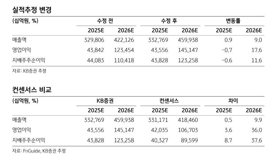 이미지 확대보기김동원 KB증권 리서치본부장은 “목표주가 상향은 D램, 낸드 가격 상승을 반영해 2026년과 2027년 영업이익을 기존 대비 각각 18%, 14% 상향한 145조원, 165조원으로 조정했기 때문”이라며 “올해 메모리 영업이익은 인공지능(AI) 데이터센터 확대에 따른 고부가 메모리 출하 증가와 가격 상승 효과로 전년 대비 324% 급증한 133조원으로 예상된다”고 전망했다.