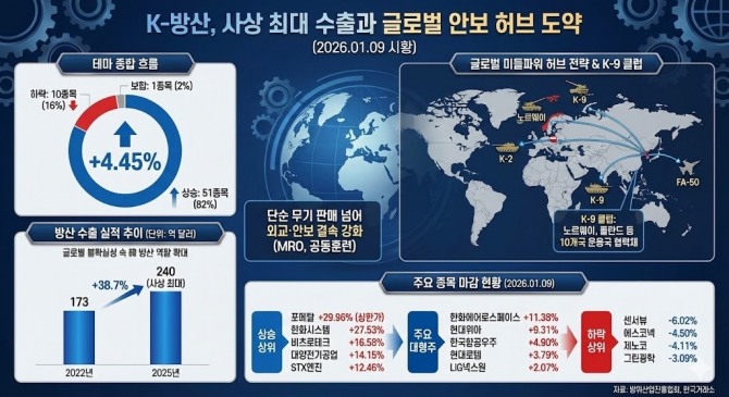 이날 방산 테마는 사상 최대 수출 실적 달성과 지정학적 가치 재평가라는 재료가 맞물리며 대다수 종목이 강한 매수세 유입을 보인 채 거래를 마무리했다.
