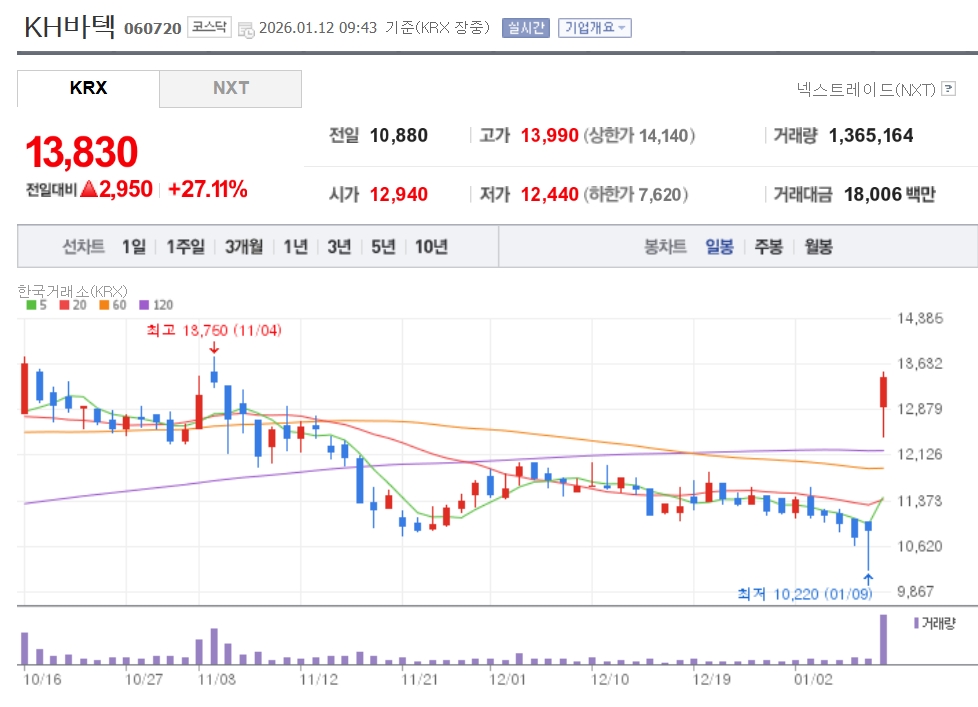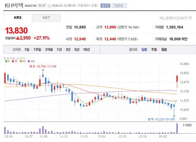 이미지 확대보기12일 한국거래소에 따르면 이날 오전 9시 43분 기준 KH바텍은 전 거래일 대비 27.11% 오른 1만3830원에 거래되고 있다.