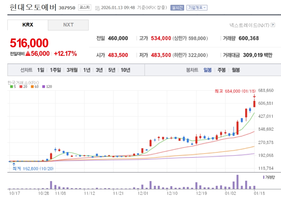 이미지 확대보기13일 한국거래소에 따르면 오전 9시48분 기준 현대오토에버는 12.17% 오른 51만6000원에 거래되고 있다. 장중 한때 53만4000원까지 오르며 신고가를 경신했다.