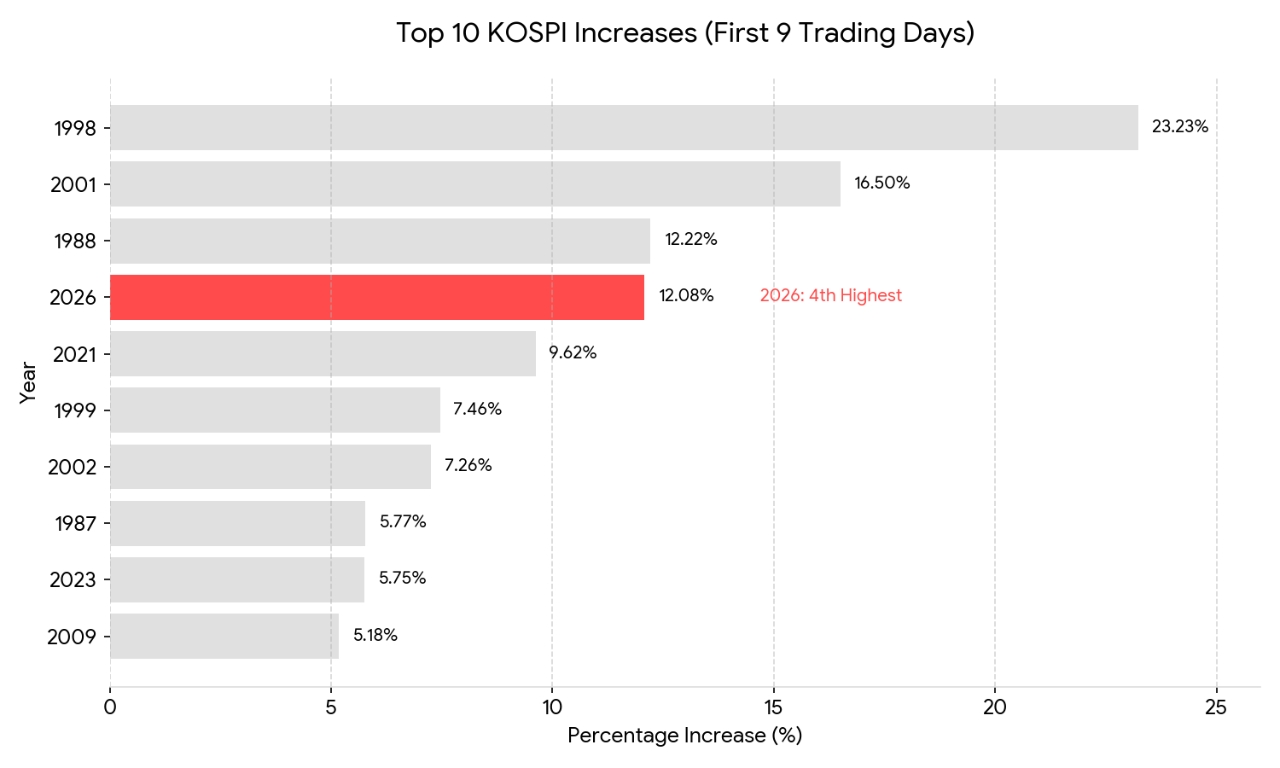이 기간 코스피의 누적 등락률은 12.08%에 달한다. 이는 한국 증시 역사상 새해 첫 9거래일 기준으로 볼 때 역대 4위에 해당하는 기록적인 수치다.