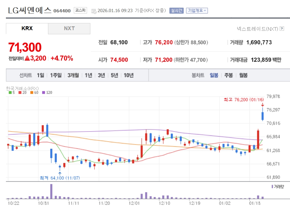 이미지 확대보기16일 한국거래소에 따르면 이날 오전 9시 23분 LG씨엔에스 주가는 전일 대비 4.70% 급등한 7만1300원에 거래되고 있다. 장중 7만6200원을 터치하기도 했다. 전일 10.19% 급등한데 이어 이틀 연속 급등세가 이어지고 있다.