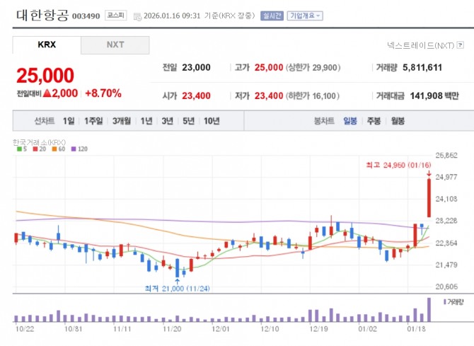 이미지 확대보기16일 한국거래소에 따르면 이날 오전 9시 31분 기준 대한항공은 전 거래일 대비 8.70% 오른 2만5000원에 거래되고 있다.