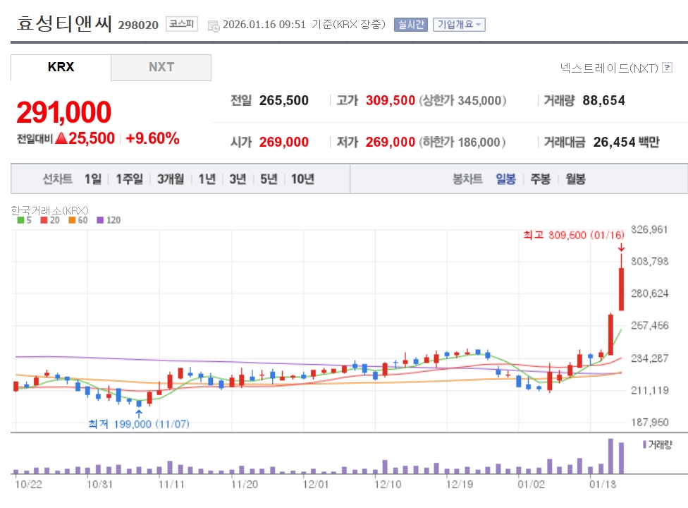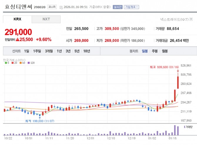 이미지 확대보기16일 한국거래소에 따르면 이날 전 거래일 대비 8.47% 오른 28만8000원에 거래를 마감했다. 장중 한때 30만9500원까지 오르며 52주 신고가를 경신했다.