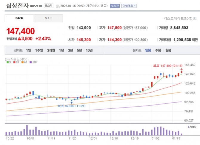 이미지 확대보기16일 한국거래소에 따르면 삼성전자는 전 거래일 대비 3.47% 오른 14만8900원에 거래를 마감했다. 장중 한때 14만9500원을 기록하며 1년 중 최고가를 경신했다.