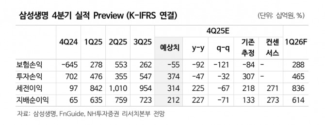 정 연구원은 "일탈회계 중단에 따라 부채 계약자지분조정 12조8000억원 대부분이 자기자본으로 이동하고, 삼성전자 주가 상승을 반영한 것"이라고 짚었다. 또 "4분기 지배주주순이익은 2116억원으로 컨센서스(시장전망치)를 하회할 것으로 예상한다"며 "보험금 예실차는 선방하지만 사업비 예실차는 악화할 것이고, 이외 3000억원 규모의 손실계약비용 등이 발생할 예정"이라고 부연했다.