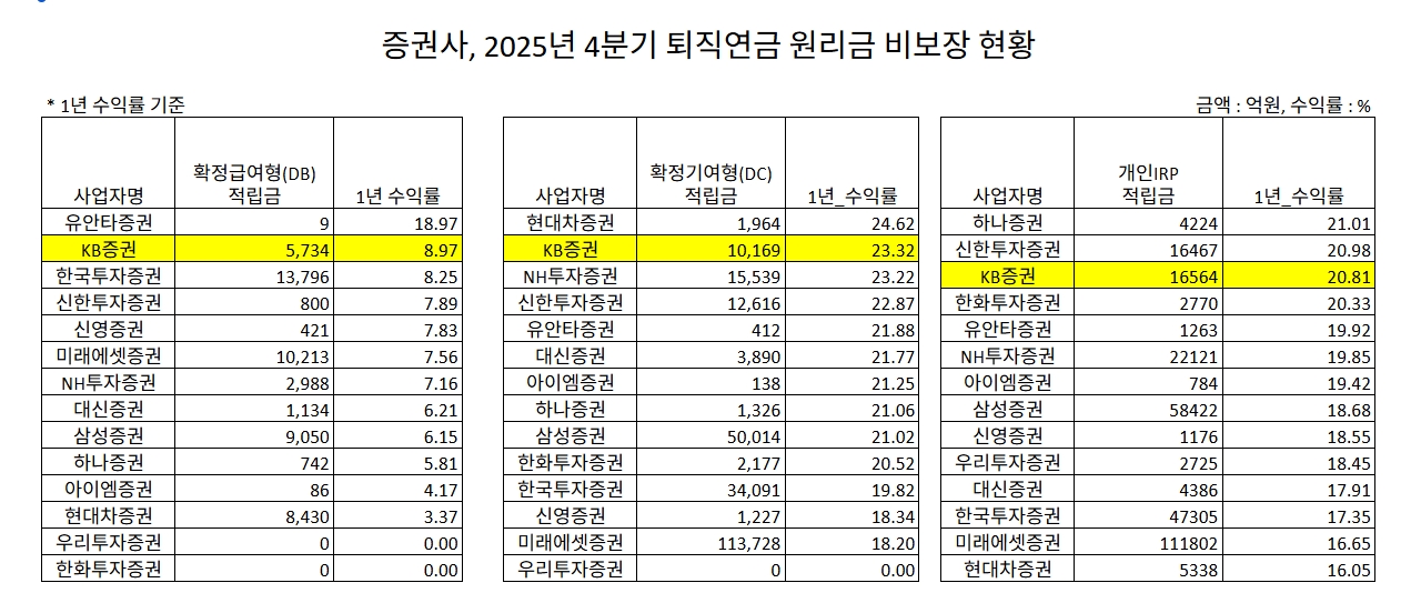 KB증권은 원리금비보장형 1년 수익률 기준 DB형 8.97%, DC형 23.32%로 각각 2위에 올랐으며, 개인형퇴직연금(IRP) 부문에서도 20.81%의 수익률을 기록하며 3위를 차지했다. 원리금비보장상품은 ETF와 펀드 등 실적배당형 상품을 포함한다.