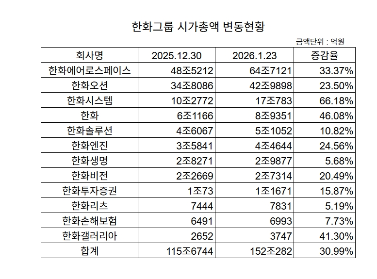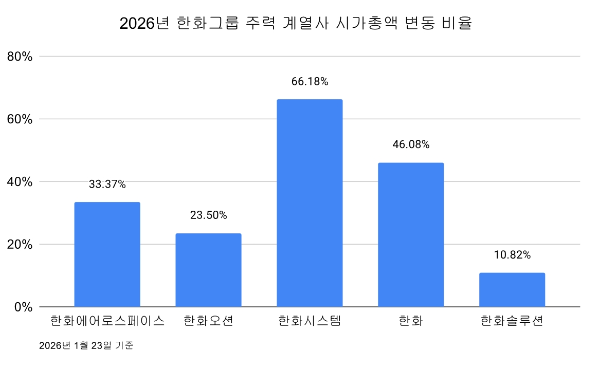 한화에어로스페이스·한화오션·한화시스템이 그룹 시총 증가의 주역이지만, 나머지 계열사들도 동반 상승세를 보였다.