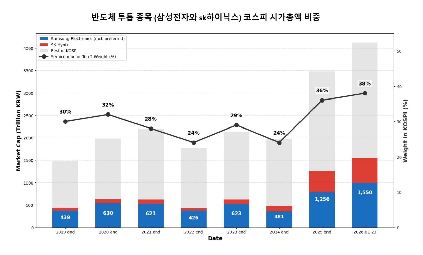 불과 3년여 만에 코스피 전체 시가총액은 133.5% 증가했지만, 같은 기간 반도체 투톱 합산 시가총액은 263.4% 늘어나며 지수 대비 증가 속도가 훨씬 가팔랐다. 그 결과 코스피 내 반도체 투톱 비중은 24%대에서 37%대로 13%포인트 이상 확대됐다.