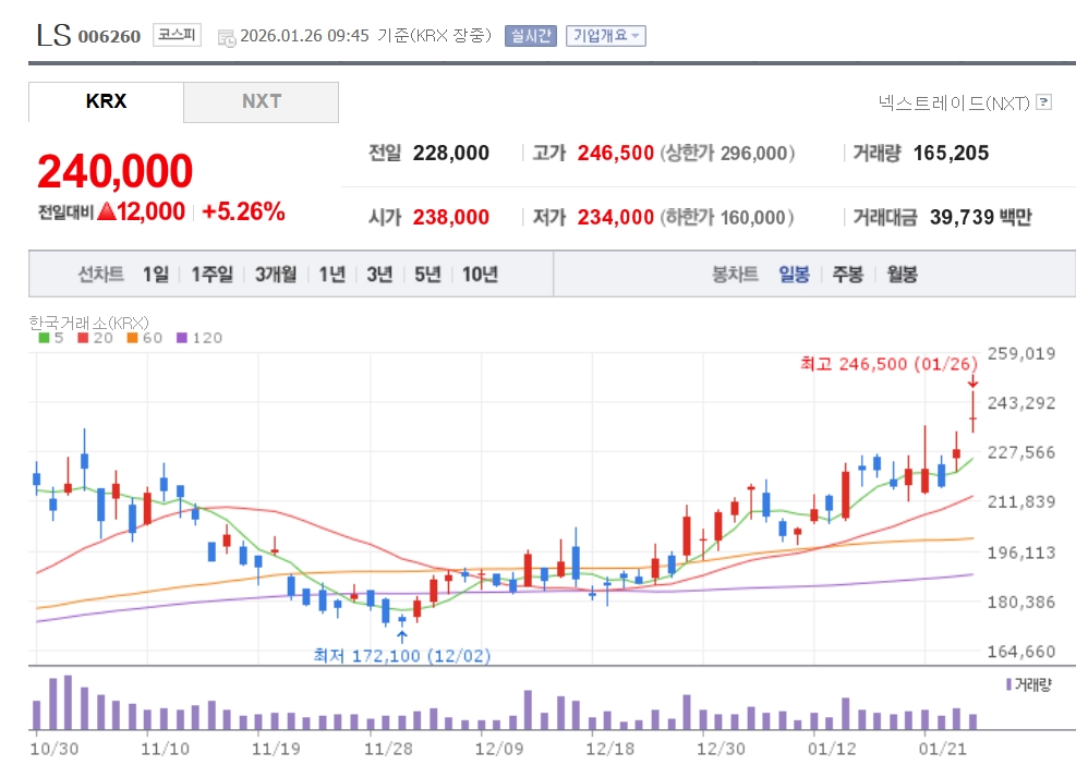 이미지 확대보기26일 한국거래소에 따르면, LS는 이날 오전 9시 45분 기준 전 거래일 대비 5.26% 오른 24만원에 거래 중이다.