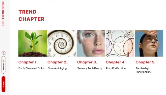 유씨엘은 2026년 스킨케어 트렌드를 ▲Earth-Centered Calm ▲Slow Anti-Aging ▲Sensory & Tech Beauty ▲Post-Purification ▲Featherlight Efficacy 등 5가지로 제시했다. 공통된 흐름은 자극을 최소화하면서도 효능과 감각을 동시에 만족시키는 방향이다.