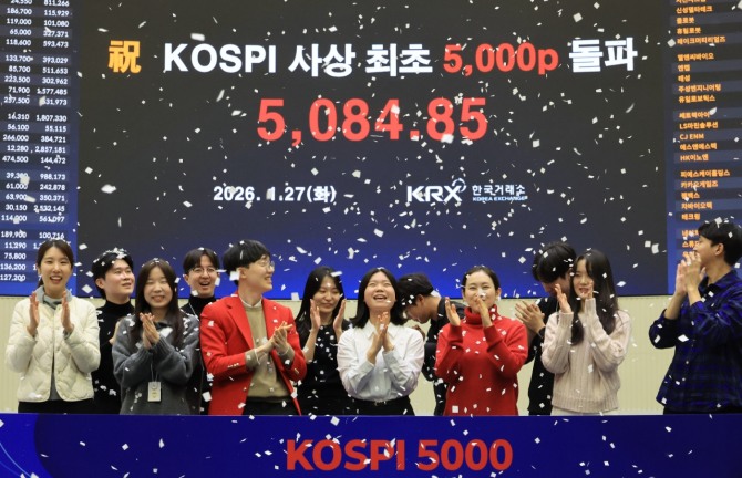 이미지 확대보기27일 한국거래소에 따르면 코스피는 사상 처음으로 종가 기준 5000선을 돌파하며 전 거래일 대비 2.73%(135.26포인트) 상승한 5084.85로 마감했다.