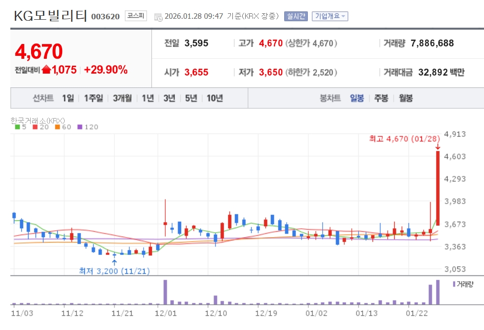 이미지 확대보기28일 한국거래소에 따르면 이날 오전 9시 47분 기준 KG모빌리티(KGM)는 전 거래일 대비 29.90% 오른 4670원에 거래되고 있다.