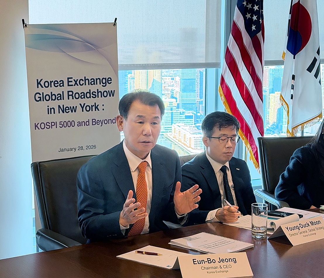 한국거래소는 지난 28일 오전10시(현지시각) 골드만삭스 뉴욕 본사에서 뉴욕 소재 주요 글로벌 투자기관을 대상으로 '코스피 5000시대 도약'을 위한 비전 홍보 및 외국인 투자 확대를 도모하고자 [Korea Exchange Global Roadshow in New York : KOSPI 5000 and Beyond] 행사를 개최하였다고 29일 밝혔다.