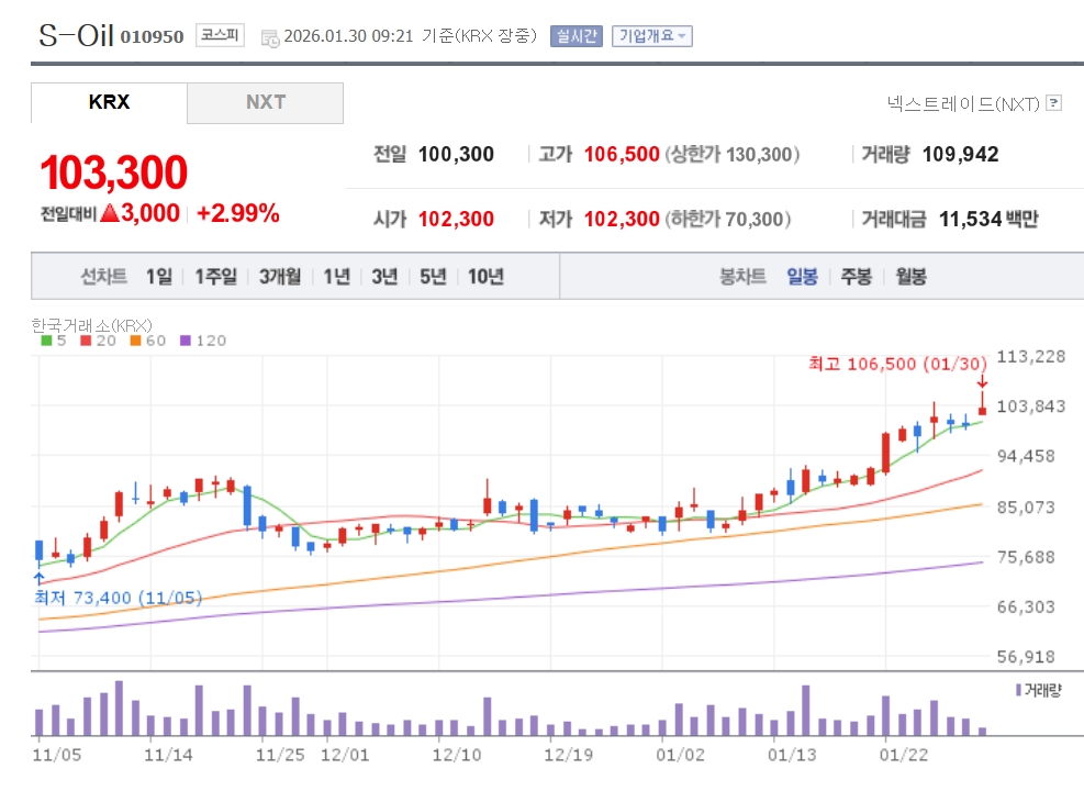 이미지 확대보기30일 한국거래소에 따르면 S-Oil은 이날 오전 09시21분 전 거래일보다 2.99% 오른 10만3300원에 거래되고 있다. SK이노베이션(1.67%), GS(1.20%) 등도 상승세다.