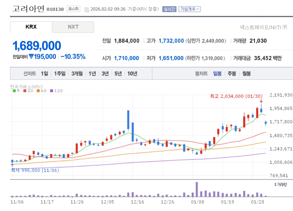 이미지 확대보기2일 한국거래소에 따르면 오전 9시 26분 기준 유가증권 시장에서 고려아연은 전 거래일 대비 10.35% 내린 168만9000원에 거래되고 있다.