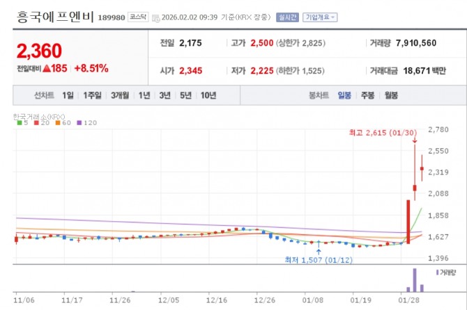 이미지 확대보기2일 한국거래소에 따르면 오전 9시39분 현재 흥국에프엔비는 전 거래일 대비 8.51% 오른 2360원에 거래되고 있다. 주가는 장중 2500원까지 올랐다. 지난달 29일 상한가에 마감하는 등 흥국에프엔비는 사흘 연속 강세를 보이고 있다.