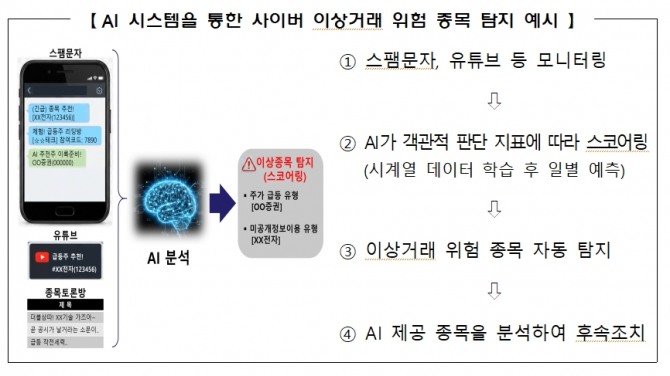 이에 따라 금융당국과 거래소는 AI 기술을 시장감시 시스템에 접목하는 방안을 추진했다. 이번에 가동되는 '사이버 이상거래 탐지 AI 시스템'은 과거 이상거래 가능성이 있다고 분류된 종목과 관련된 온라인 게시글, 스팸문자 신고 내역, 유튜브 영상, 주가 급등 데이터 등을 종합적으로 학습해 개발됐다. AI는 학습 결과를 토대로 객관적인 판단 지표를 생성하고, 사이버 정보 흐름을 상시 감시하면서 상장 종목을 점수화해 위험도가 높은 종목을 자동으로 탐지한다.
