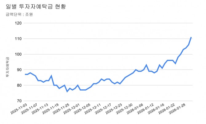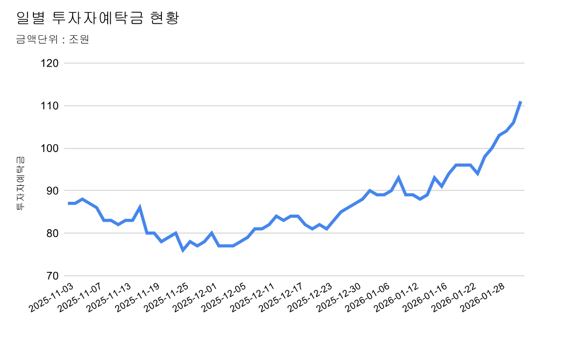 금융투자협회에 따르면 지난 2일 기준 투자자 예탁금은 111조2965억 원으로 집계됐다. 지난해 11월 초 86조 원대 수준이던 예탁금은 연말을 거치며 80조 원 안팎에서 등락을 반복하다가, 올해 1월 중순 이후 빠르게 늘어나 100조원을 넘어섰다. 특히 1월 27일 예탁금이 100조 원을 돌파한 이후에도 증가세가 이어지며 단기간에 110조 원대까지 불어났다.