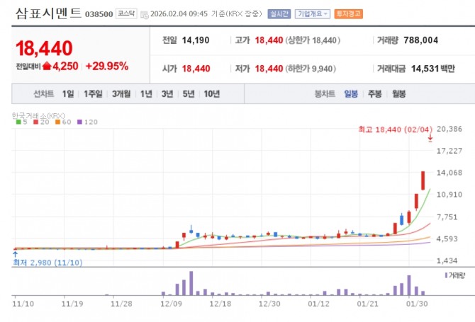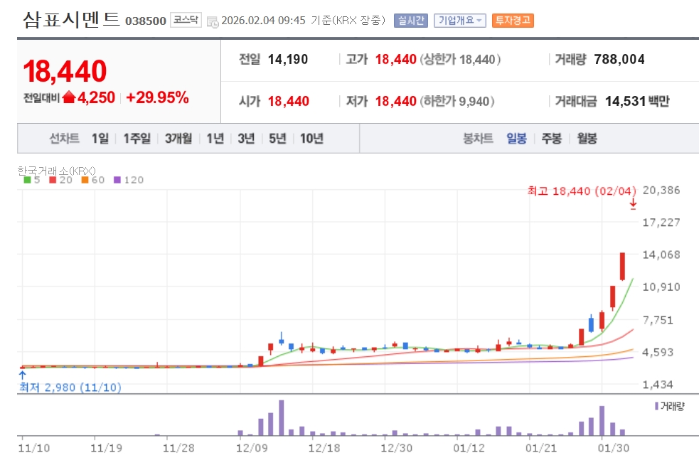 이미지 확대보기4일 한국거래소에 따르면 오전 9시45분 삼표시멘트는 전일 대비 29.95% 오른 1만8440원에 거래되고 있다.