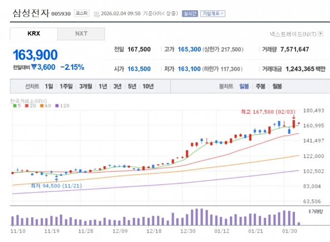 이미지 확대보기4일 한국거래소에 따르면 오전 9시50분 현재 삼성전자는 전거래일 대비 2.15% 하락한 16만3900원에 거래 중이다. SK하이닉스는 2.21% 내린 88만7000원을 기록하고 있다.