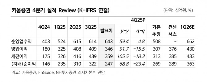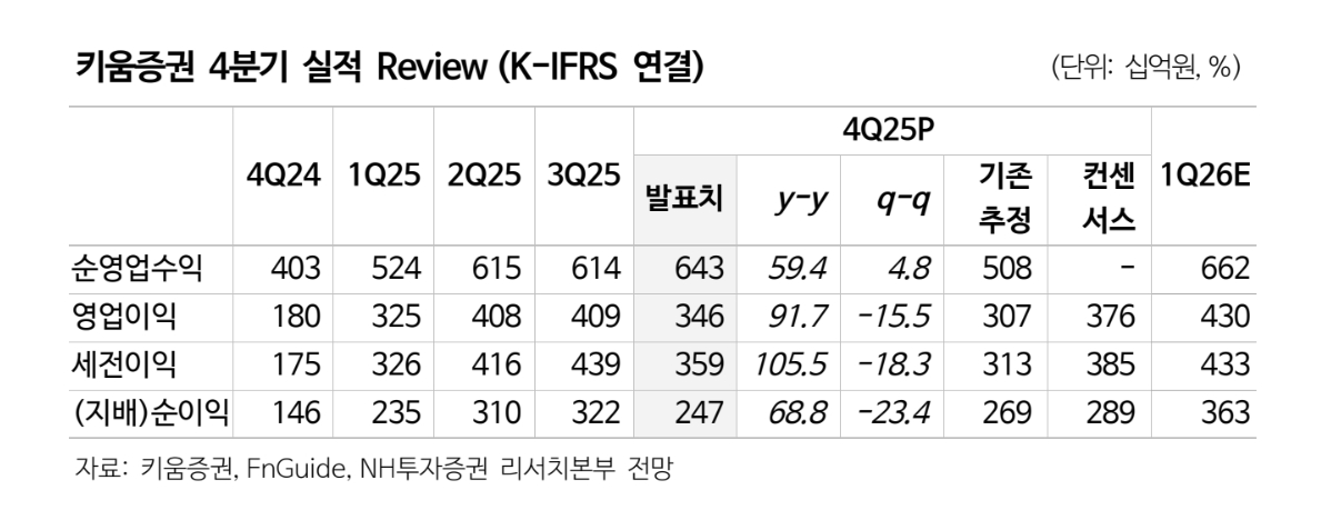 이미지 확대보기윤유동 NH투자증권 연구원은 “올해 1월 60조원대 거래대금만 보더라도 역대 최고 실적 전망”이라며 "키움증권의 지난해 4분기 실적은 성과급 확대와 해외부동산 충당금 적립 등으로 기대치를 밑돌았지만, 올해는 일회성 비용이 정상화되며 실적 모멘텀이 재차 강화될 가능성이 크다"고 진단했다.