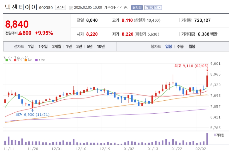 5일 한국거래소에 따르면 이날 오전 10시 00분 기준 넥센타이어는 전 거래일 대비 9.95% 오른 8840원에 거래되고 있다.