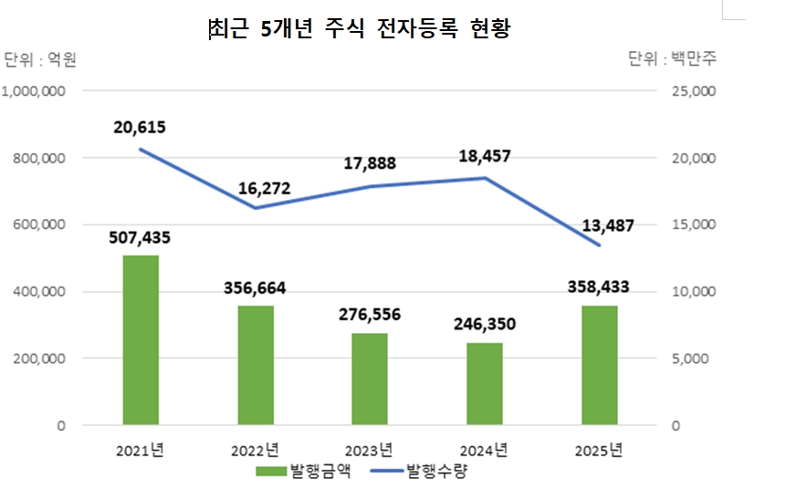 이미지 확대보기2025년 국내 주식 발행시장이 발행 수량의 감소에도 불구하고 발행 금액은 대폭 늘어나는 '내실 위주의 성장'을 기록했다. 자금 조달 규모가 커지며 시장이 한층 성숙해진 모습이다.