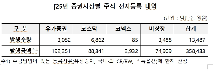 코스닥시장은 발행수량 면에서는 약 68억 6200만 주(50.9%)로 가장 큰 비중을 차지했으나, 발행금액은 8조 8341억 원(24.6%)을 기록했다. 비상장법인 또한 약 7조 4909억 원(20.9%)의 발행금액을 기록하며 장외 시장에서도 활발한 자금 조달이 이루어졌음을 입증했다.