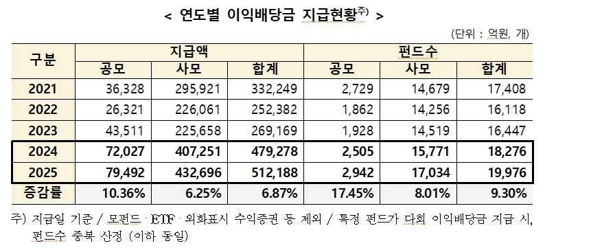 이익배당을 실시한 펀드 수도 공모(17.45%↑)와 사모(8.01%↑) 모두 늘어나 투자자들의 선택폭이 넓어졌음을 입증했다.