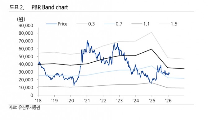 이미지 확대보기황성현 유진투자증권 연구원은 “2026년 실적 턴어라운드, 2027년 EPS 흑자 전환을 전망한다”며 투자의견 상향 배경을 설명했다. 한화솔루션의 2025년 영업손실을 3530억원, 2026년 영업이익을 4710억원으로 전망했다. 2027년에는 영업이익 8110억원을 기록하며 본격적인 실적 개선이 이뤄질 것으로 예상했다.