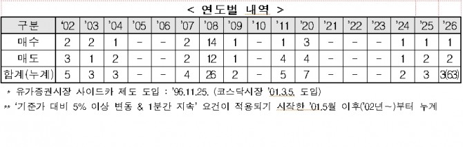 이미지 확대보기한국거래소는 5일 오전 9시 6분 유가증권시장에 매도 사이드카가 발동됐다고 밝혔다. 이는 올해 들어 세 번째 사이드카 발동으로, 앞서 매도 사이드카 2회와 매수 사이드카 1회가 발동된 바 있다.