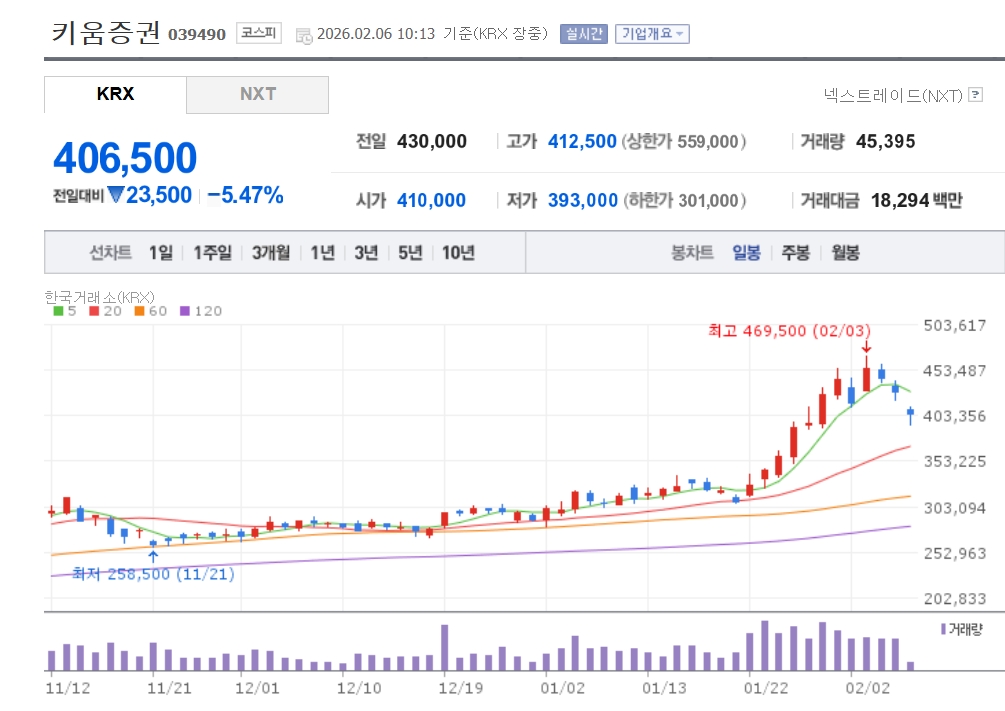 이미지 확대보기6일 한국거래소에 따르면 오전 10시13분 현재 키움증권은 전장대비 5.47% 떨어진 주당 40만6500원에 거래되고 있다. 미래에셋증권 은 3.23%, 한국금융지주 는 3.78% 낙폭을 기록 중이다.