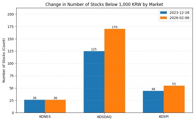 유가증권시장에서도 유사한 흐름이 관측된다. 2023년 말 44개였던 1000원 미만 종목은 올해 2월 55개로 늘었다. 절대적인 수는 코스닥보다 적지만, 유가증권시장 역시 일부 중·저가 종목이 장기간 하락 국면에서 벗어나지 못하고 있음을 보여준다. 전통 산업이나 소외 업종의 부진이 누적된 결과라는 해석이 나온다.