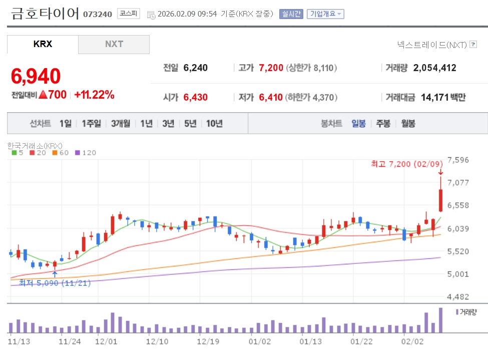 이미지 확대보기9일 한국거래소에 따르면 오전 9시 54분 기준 금호타이어는 전 거래일 대비 11.22% 오른 6940원에 거래 중이다. 장중 7200원까지 오르며 1년 내 최고가를 새로 썼다.