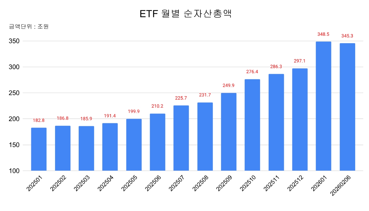 월별 흐름을 살펴봐도 성장세는 뚜렷하다. 2025년 1월 182조8000억원이던 ETF 순자산은 같은 해 12월 297조1000억원까지 늘며 1년 새 110조원 이상 증가했다. 특히 지난해 하반기부터 월별 증가율이 눈에 띄게 높아졌고, 올해 1월에는 증가율이 17%를 넘기며 정점을 찍었다.